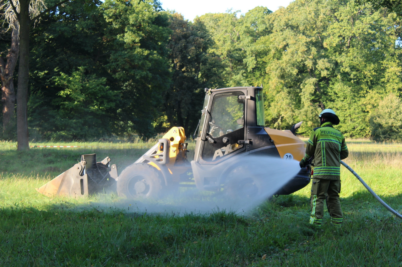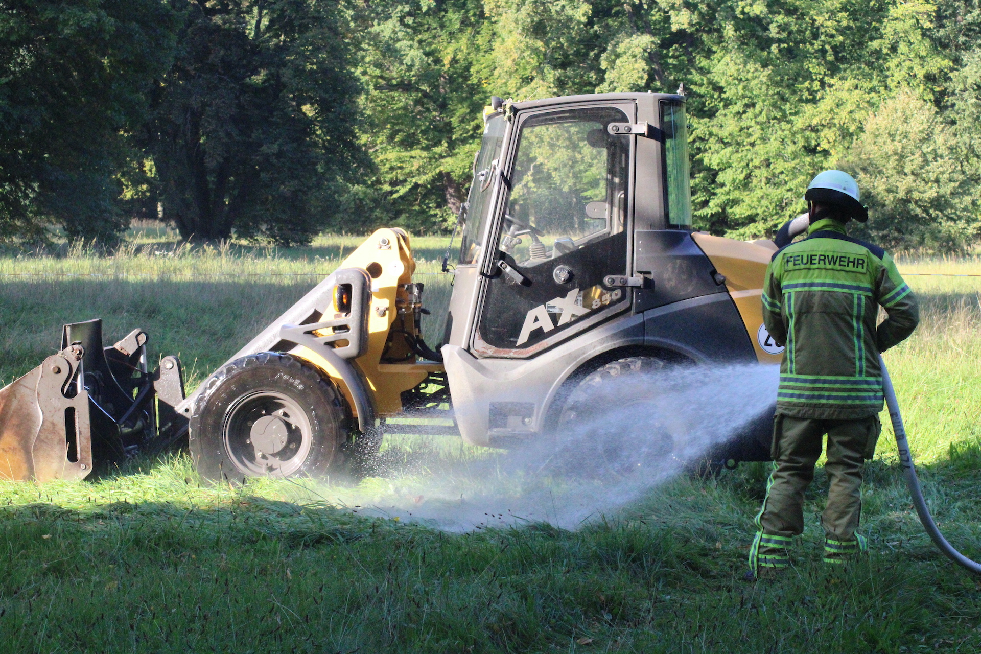 Brandbekämpfung Fläche – Eindämmen des Flächenbrandes und Löschen des Radladers.