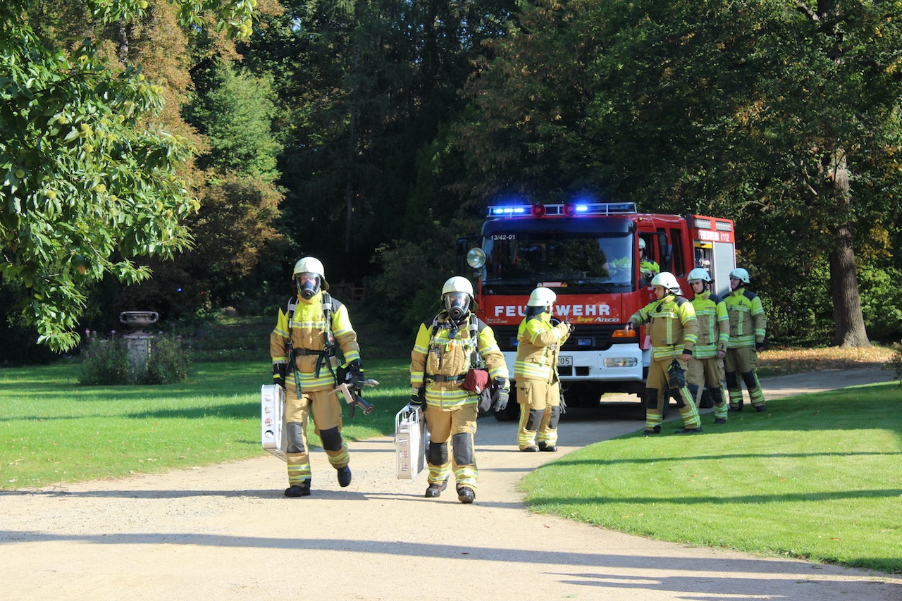 Parallel zur Brandbekämpfung mussten weitere Gefahrenlagen gemeistert werden: So wurden im Verlauf zwei vermisste Personen im Teich hinter dem Schloss entdeckt und mit einem Boot gerettet.