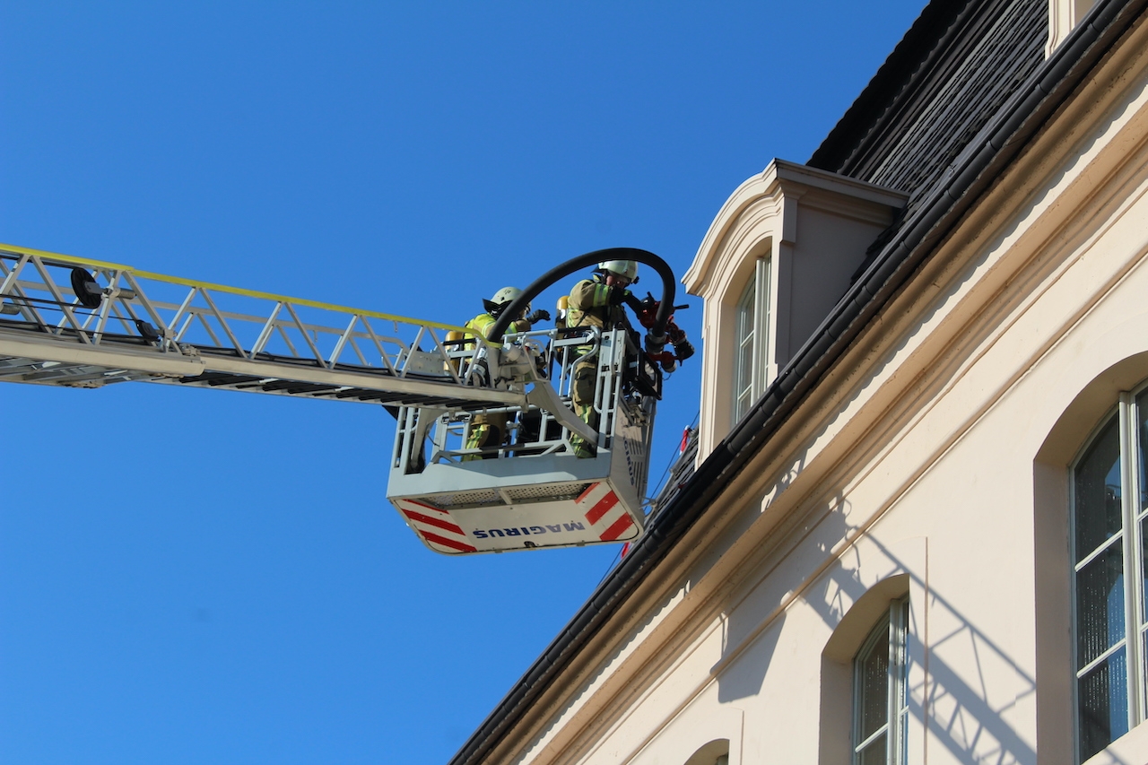 Doch das Szenario nahm rasch größere Dimensionen an: Funkenflug ließ den Brand auf angrenzendes Ödland übergreifen. Schließlich griffen die Flammen auch auf den Dachstuhl des Schlosses über. Damit stand ein Objekt im Mittelpunkt, das nicht nur ein bedeutendes Bauwerk, sondern auch Träger wertvoller Kunst- und Kulturgüter ist.