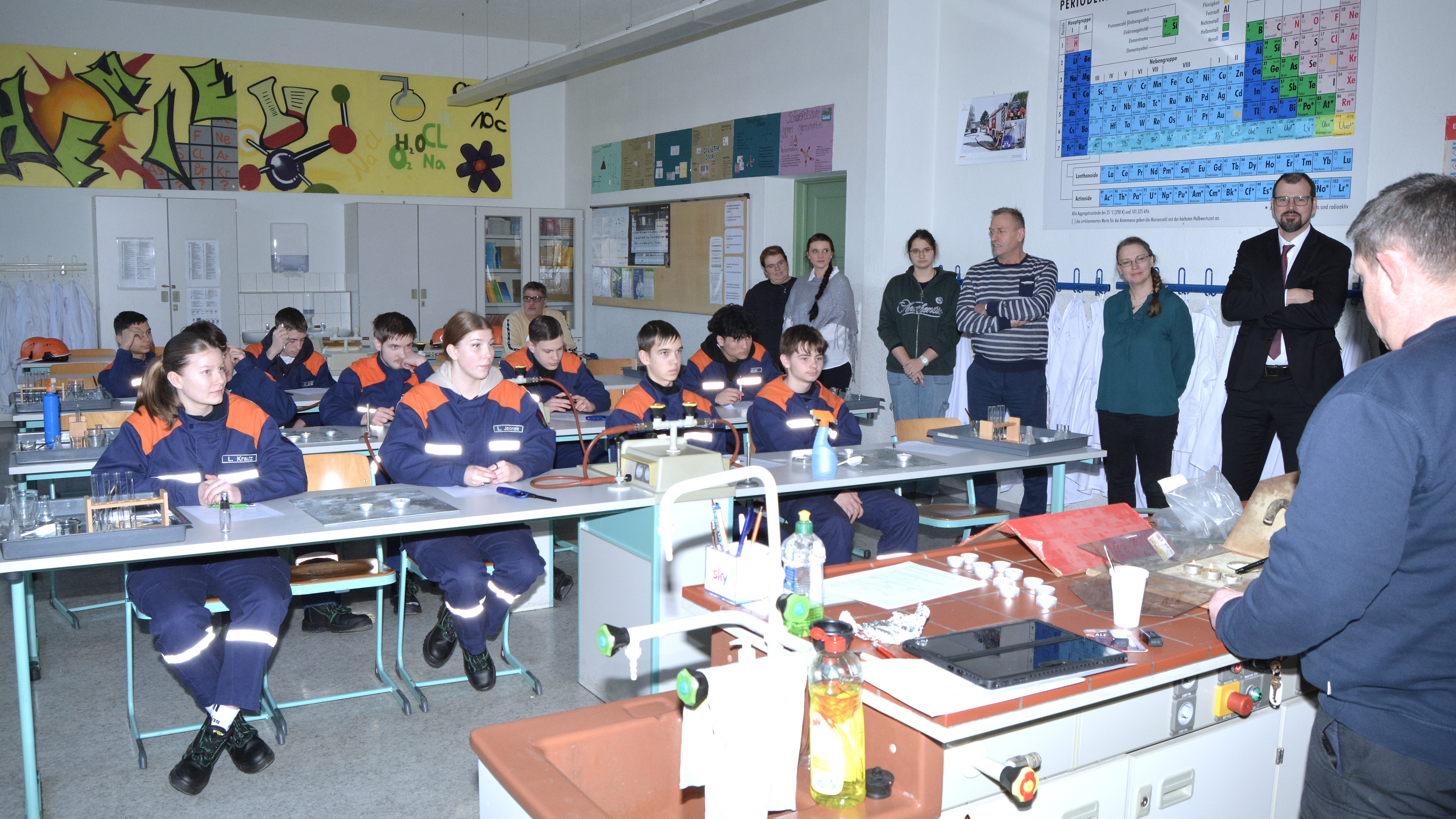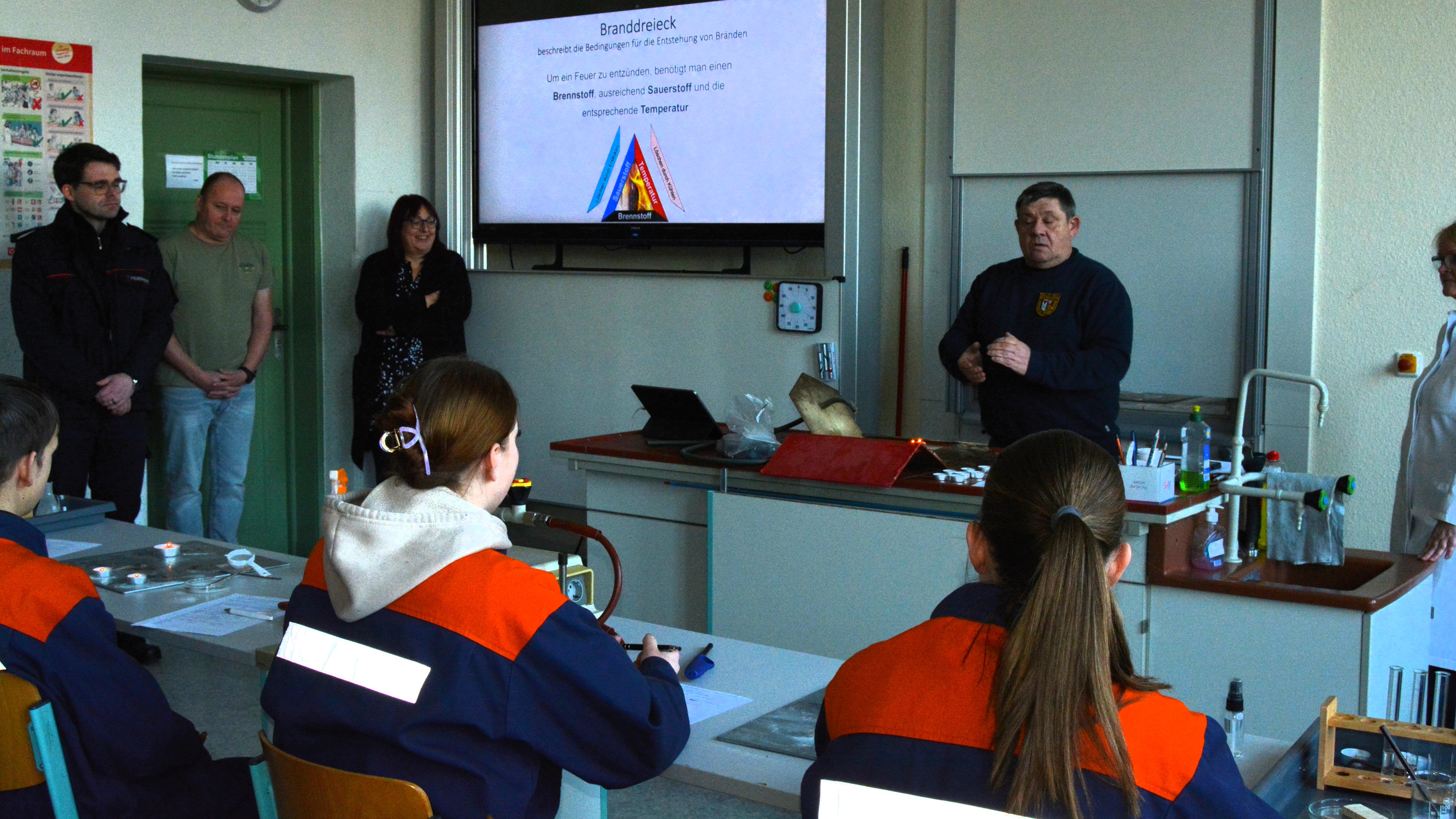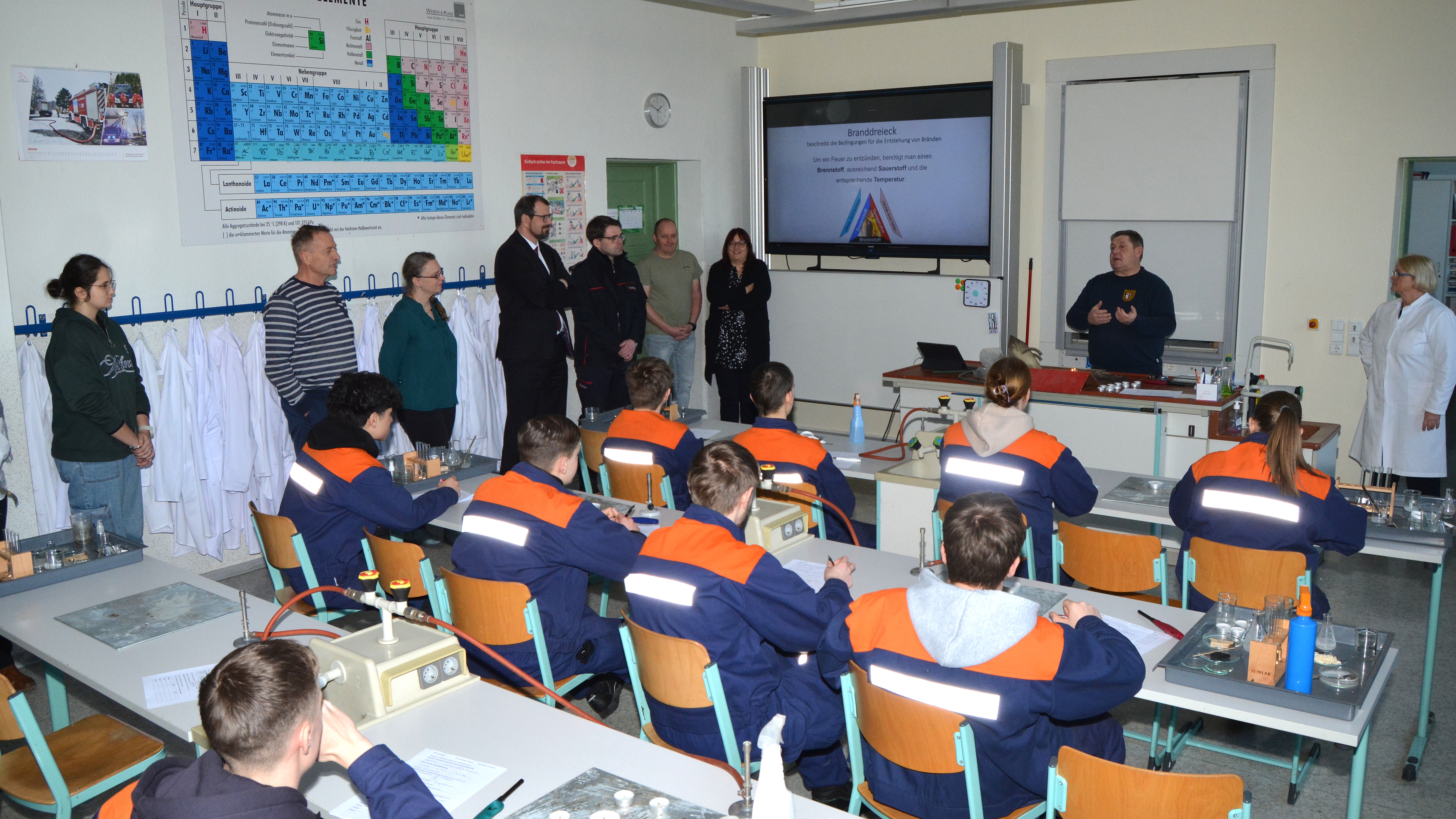 Ergänzend dazu erläuterte der zuständige Sachbearbeiter für das Wahlpflichtfach des Landkreis Spree-Neiße, Kamerad Voigt, gemeinsam mit der Chemielehrerin der BOS praxisnahe Experimente zum Brandverhalten verschiedener Stoffe. Diese anschaulichen Vorführungen verdeutlichten eindrucksvoll den hohen praktischen und pädagogischen Mehrwert des Wahlpflichtfaches Feuerwehr für die Schülerinnen und Schüler.