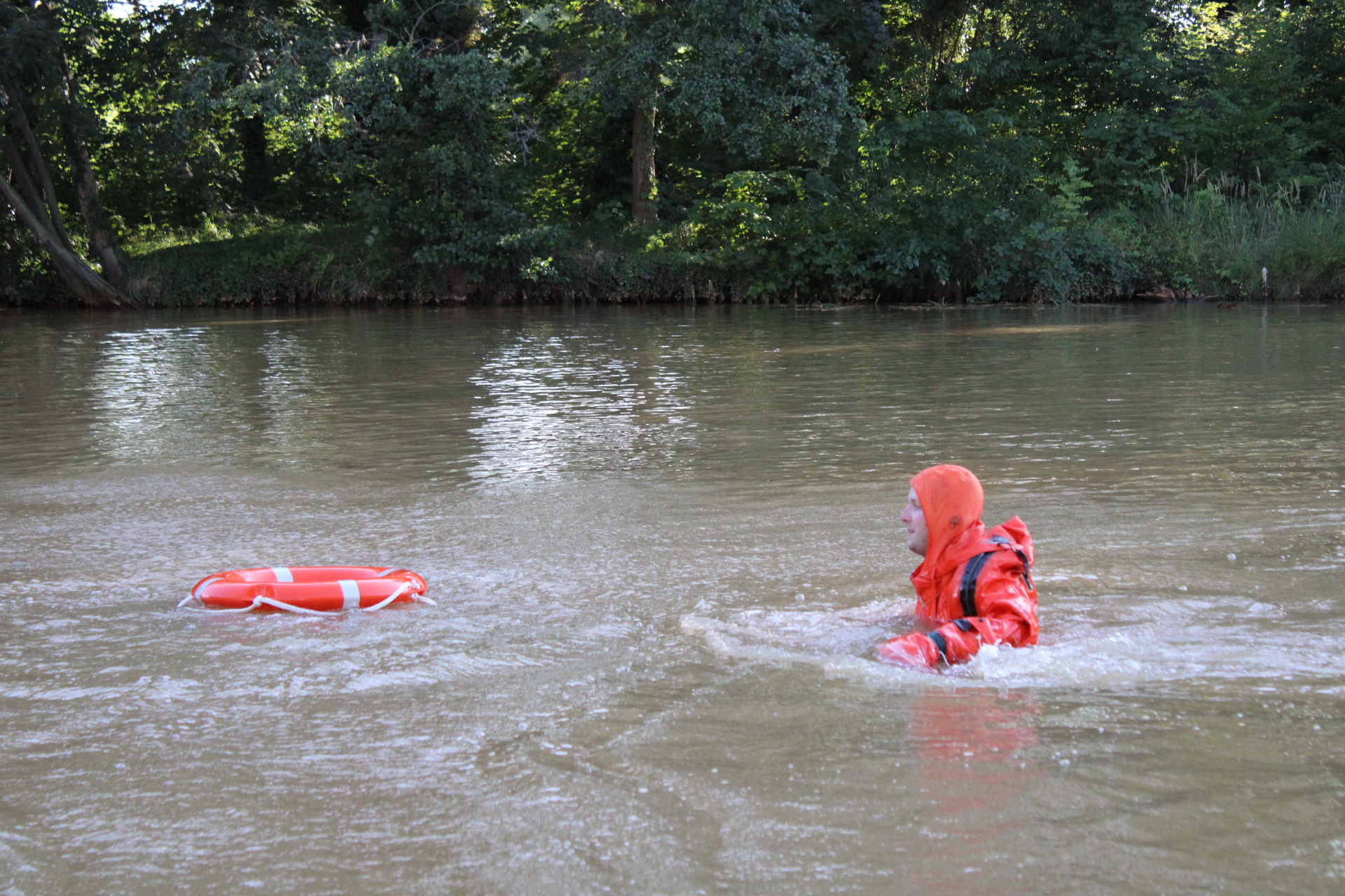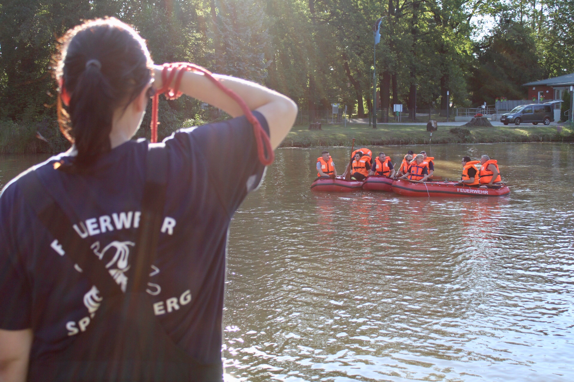 Nachdem die Besatzungen auf den Einsatzfahrzeugen eingeteilt wurden, ging es zum Bootshaus an die Spree. Dort gab es vom Ausbildungsverantwortlichen Andreas Mikwauschk eine Einweisung über die Handhabung und den Umgang mit dem Schlauchboot, sowie der richtigen Trageweise der Schwimmwesten. Nachdem der theoretische Teil abgeschlossen war, wurden die Schlauchboote zu Wasser gelassen und zur Eingewöhnung eine Runde auf der Spree Fluss aufwärts gepaddelt. Danach galt es die erste Aufgabe zu bewältigen. Ein Kamerad stellte sich als ''Unfallopfer'' zur Verfügung, dieser musste beruhigt werden, im Schlauchboot aufgenommen und an Land gebracht werden. Als Nächstes wurde auch das Werfen mit dem Rettungsring vom Land aus geübt. Was die Kameradinnen und Kameraden sehr gut bewältigten. Zum Abschluss des Dienstes konnten die Kameraden ihr Können auf die Wildwasserbahn am Weißen Wehr unter Beweis stellen.