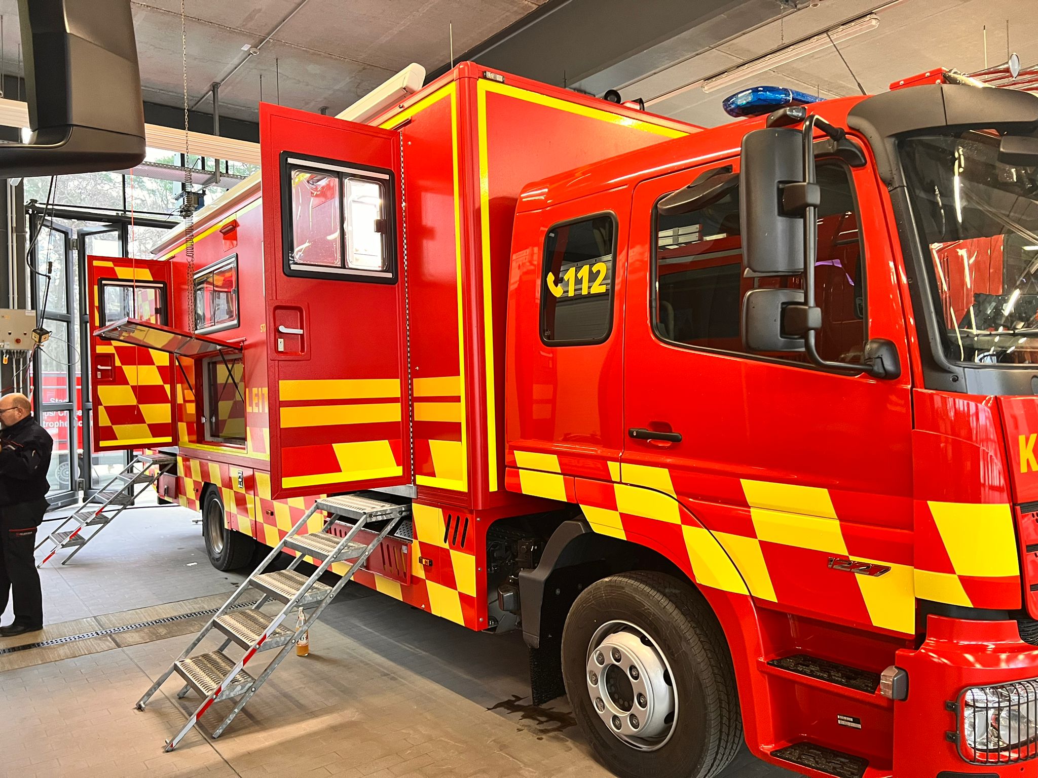 Neu ist zudem ein großer Außenmonitor, der es ermöglicht, Lagevorträge außerhalb des Fahrzeugs durchzuführen und ein einheitliches Lagebild für alle Beteiligten darzustellen. Beispielsweise können Live-Bilder einer Drohne der angegliederten SEG Flight übertragen werden, um bei Wald- oder Flächenbränden die Ausbreitung zu analysieren und taktische Maßnahmen abzustimmen.
