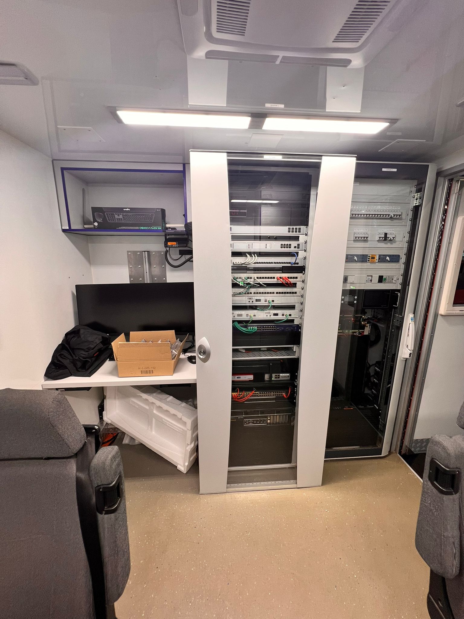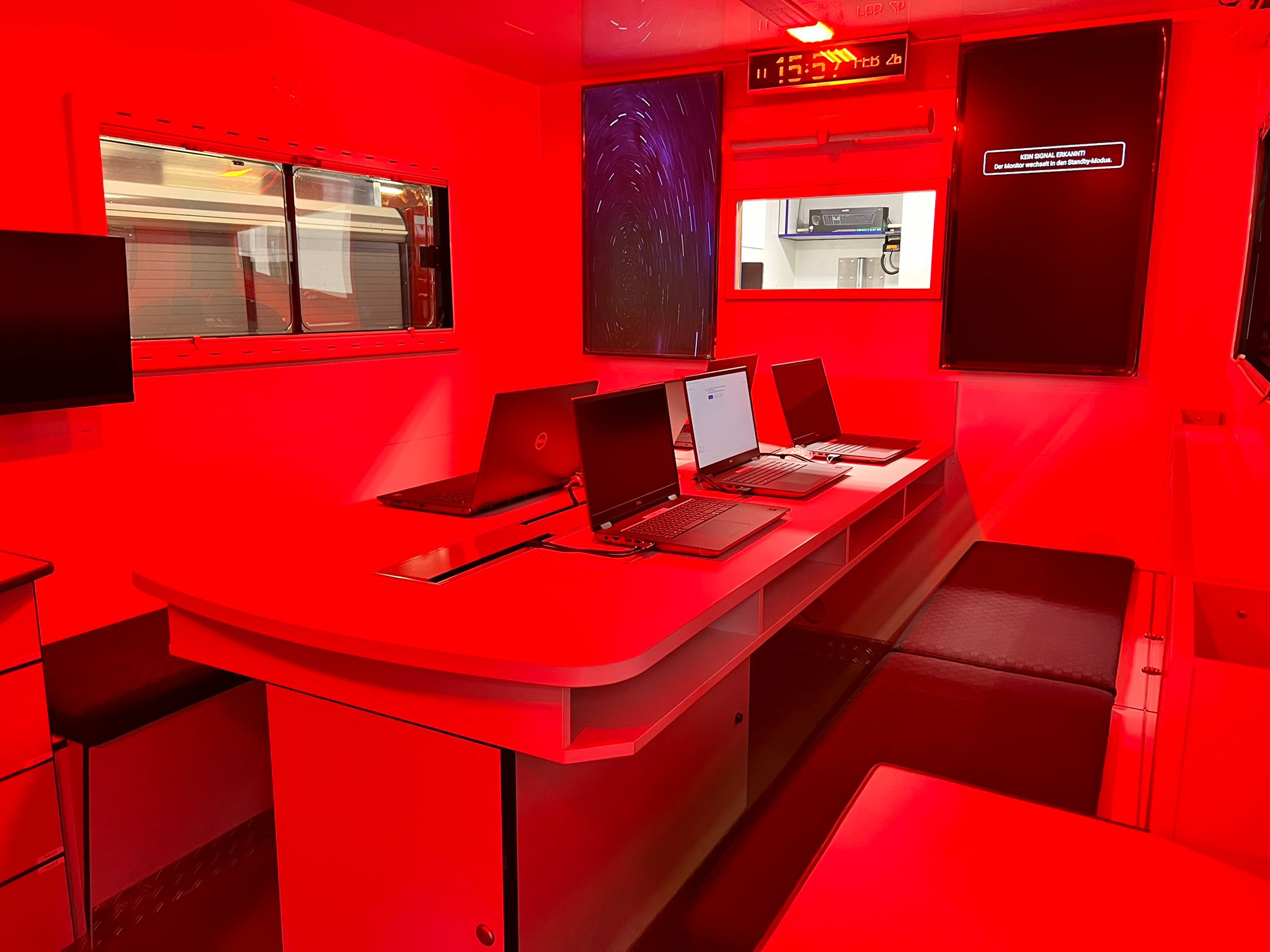 Wie nach Norm vorgesehen, ist der Aufbau zweigeteilt. In der Fernmeldebetriebsstelle, dem sogenannten Funkraum, stehen zwei Arbeitsplätze zur Verfügung. Hier werden eingehende und ausgehende Nachrichten bearbeitet, der Funkverkehr koordiniert und das Einsatztagebuch geführt. Auf der gegenüberliegenden Seite befindet sich der Führungs- und Besprechungsraum mit sechs Notebookarbeitsplätzen, zwei großen Monitoren sowie interaktiven Monitorboards. Dort werden Lageinformationen zusammengeführt, ausgewertet und unter anderem mit der Lage-Software Command-X dokumentiert und visualisiert. So erhalten die Führungskräfte eine strukturierte Entscheidungsgrundlage.