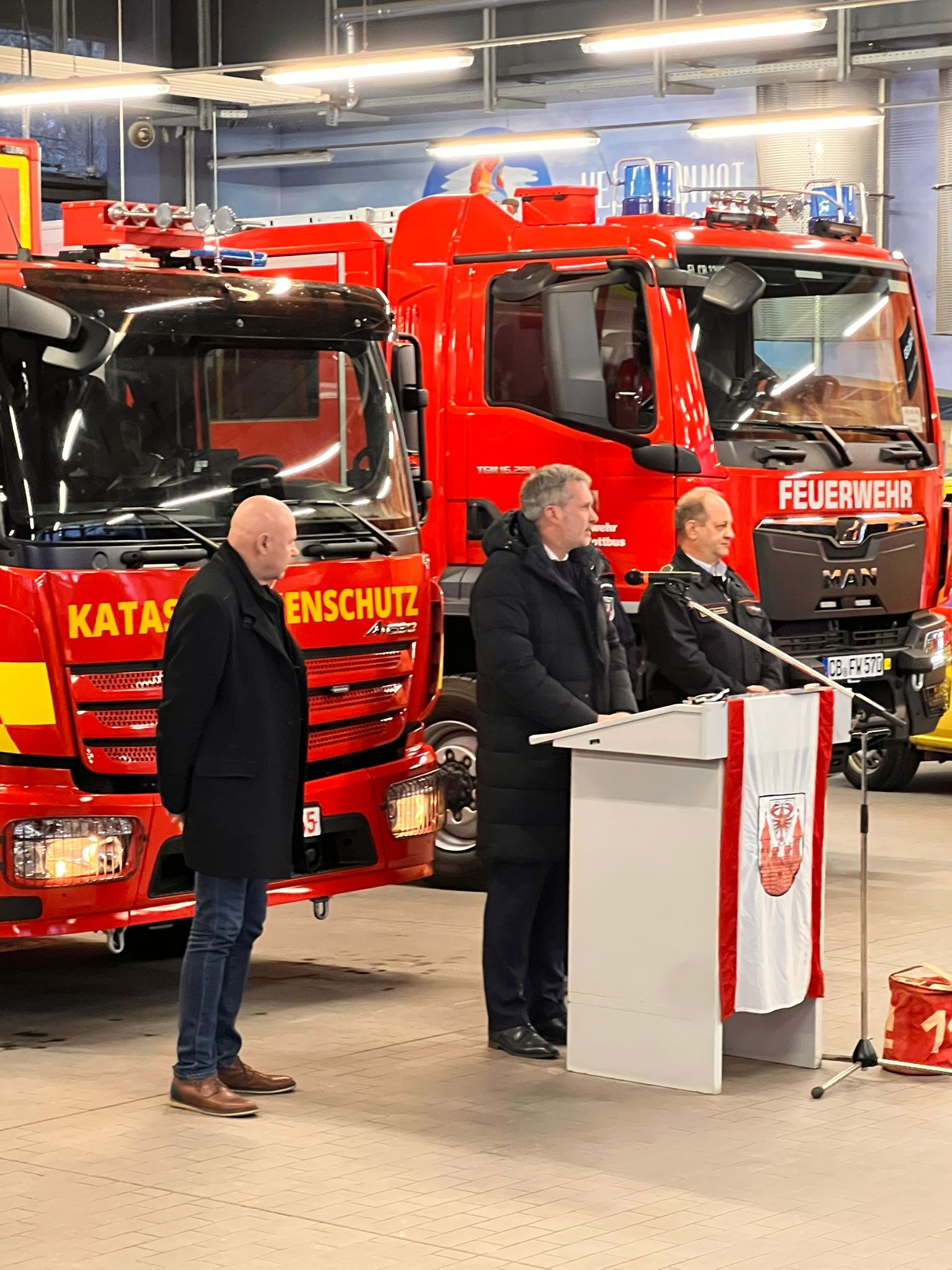 Insgesamt standen dabei Investitionen in Höhe von rund 1,9 Millionen Euro. Neben drei Hilfeleistungslöschfahrzeugen für die Freiwilligen Feuerwehren in Schmellwitz, Kahren und Ströbitz sowie einem für die Notfallseelsorge umgebauten ehemaligen Notarzteinsatzfahrzeug rückte insbesondere der modernisierte Einsatzleitwagen 2 in den Mittelpunkt der Veranstaltung.