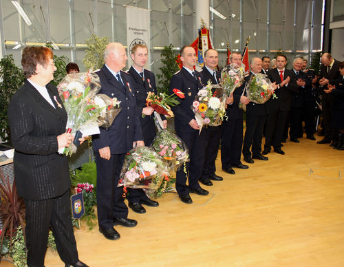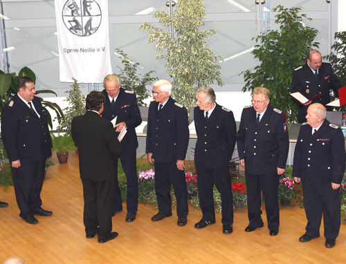 In Würdigung hervorragender Leistungen auf dem Gebiet des Feuerwehrwesens und der kreislichen Verbandsarbeit erhielten die Kameradin Heike Gardy und die Kameraden Manfred Pank, Dietmar Chilla, Ralf Zimmermann, Uwe Bertels und Norbert Lucia das Ehrenzeichen des Kreisfeuerwehrverbandes Spree-Neiße e.V.